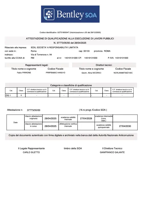 L’ottenimento dell’Attestazione SOA rilasciata da Bentley SOA rappresenta per iEdil un traguardo fondamentale e una garanzia assoluta per i nostri committenti. Questa certificazione non è solo un obbligo di legge per la partecipazione ad appalti pubblici superiori a 150.000 €, ma è l'evidenza ufficiale della nostra solidità finanziaria e della nostra esperienza operativa nel settore delle costruzioni.